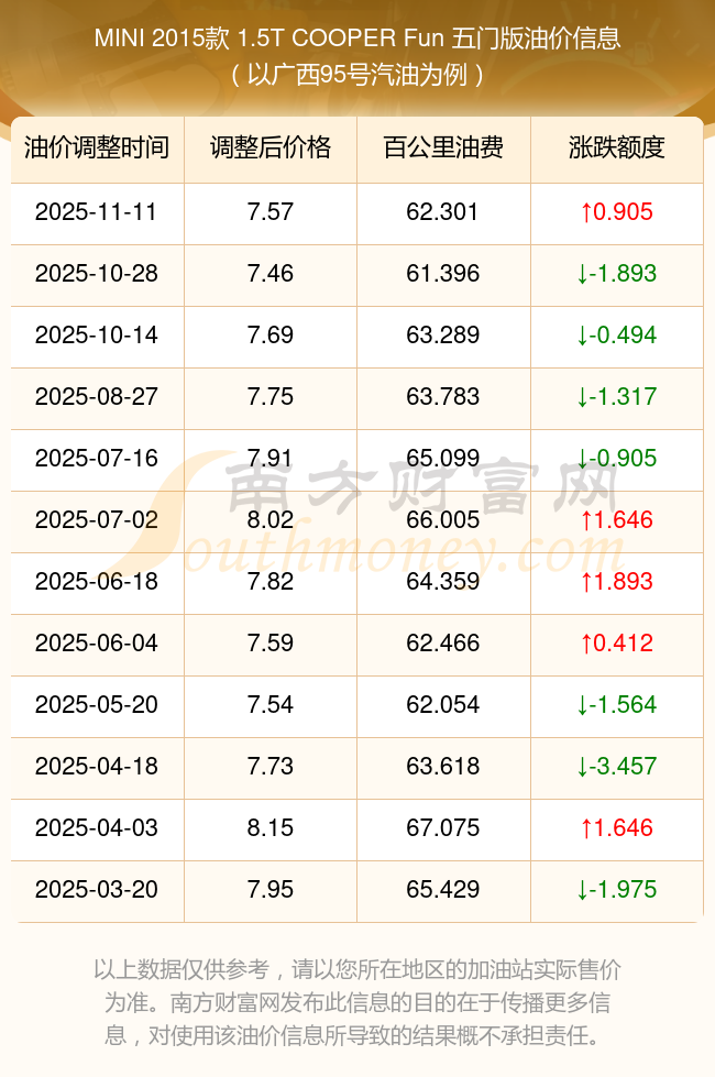 依照11月11日95號汽油最新調(diào)整價格7.57元/升來計算(以廣西為例),該車型百公里的平均油費(fèi)是62.301元,依照上一輪10月28日調(diào)整價格7.46元/升來計算,百公里的平均油費(fèi)是61.396元,對比上一輪多花0.905元,下一輪的油價調(diào)整時間11月24日24時。