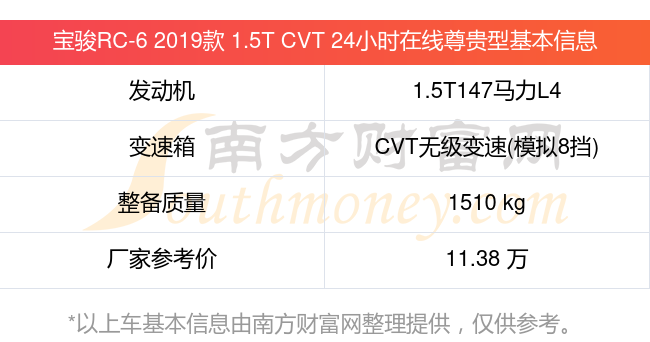寶駿RC-6 2019款 1.5T CVT 24小時在線尊貴型動力上配備的是一臺1.5T147馬力L4渦輪增壓發(fā)動機(jī),匹配的是CVT無級變速(模擬8擋)自動檔變速箱,燃料形式為汽油,常規(guī)整備質(zhì)量1510kg,廠家參考價11.38萬元。