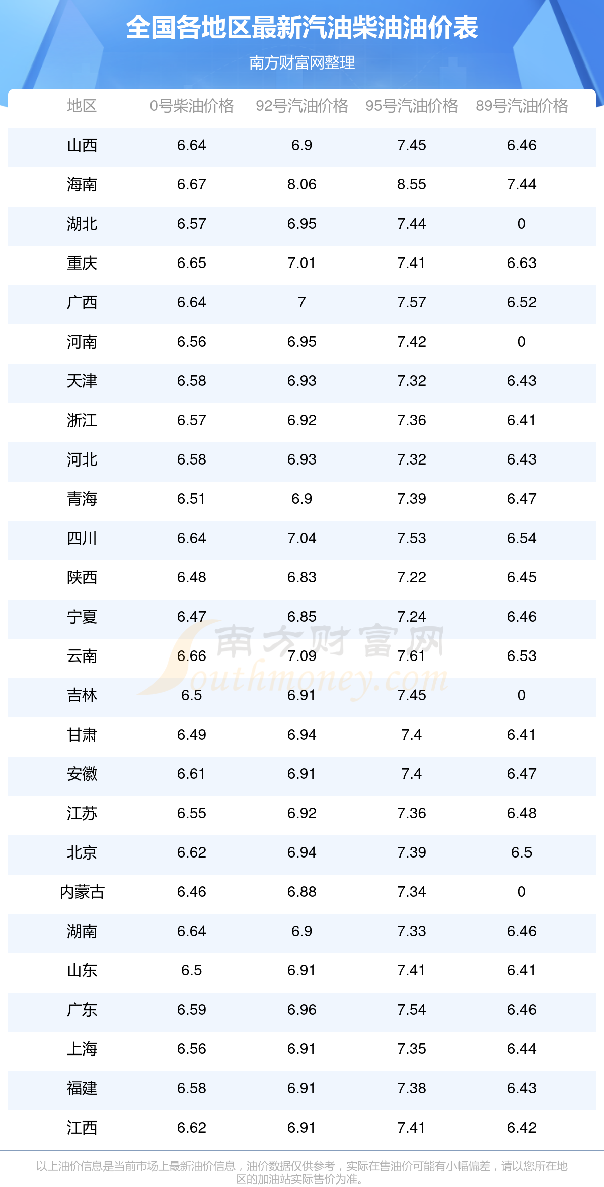 以上數據僅供參考,請以您所在地區(qū)的加油站實際售價為準。南方財富網發(fā)布此信息的目的在于傳播更多信息,對使用該油價信息所導致的結果概不承擔責任。