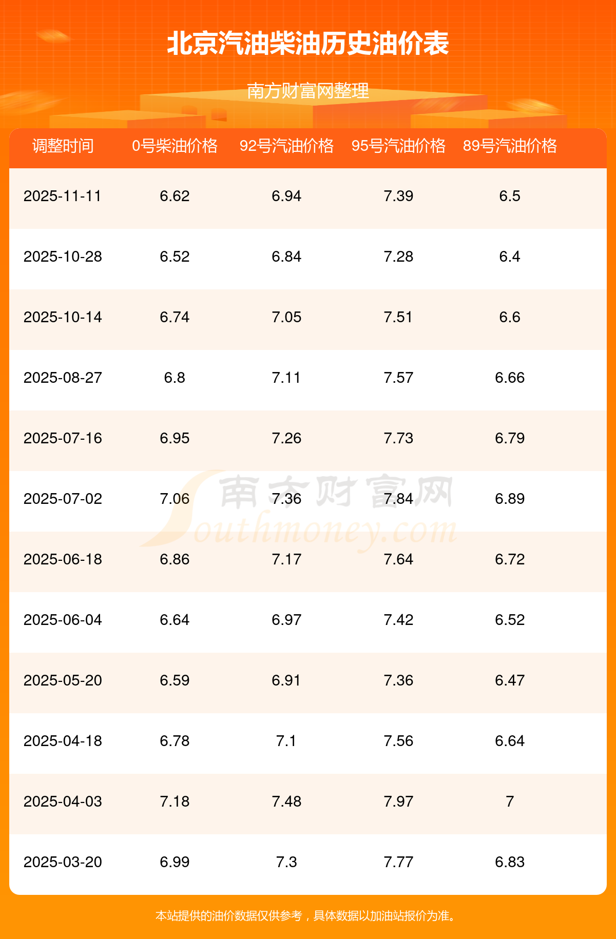 11月16日北京汽油、柴油每升的價(jià)格為:92號(hào)汽油為6.94元,升了0.1元;95號(hào)汽油為7.39元,升了0.11元;89號(hào)汽油為6.5元,升了0.1元;0號(hào)柴油為6.62元,升了0.1元,本輪油價(jià)的調(diào)整時(shí)間為11月11日。