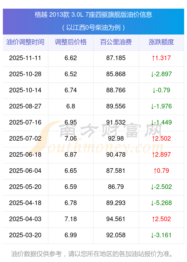 根據(jù)11月11日0號(hào)柴油最新調(diào)整價(jià)格6.62元/升來計(jì)算(以江西為例),該車型每百公里的平均油費(fèi)是87.185元,上一輪10月28日調(diào)整價(jià)格6.52元每升來計(jì)算,每百公里的平均油費(fèi)是85.868元,對(duì)比上一輪多花1.317元,下一輪的油價(jià)調(diào)整時(shí)間是11月24日24時(shí)。