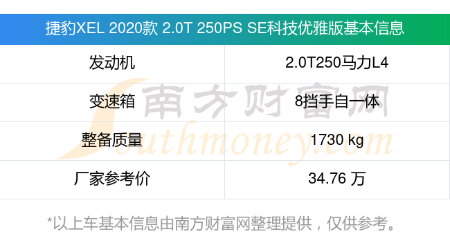 捷豹XEL 2020款 2.0T 250PS SE科技優(yōu)雅版搭載了一臺2.0T250馬力L4渦輪增壓發(fā)動機(jī),采用8擋手自一體自動檔變速箱,常規(guī)整備質(zhì)量1730kg,廠家參考價34.76萬元。