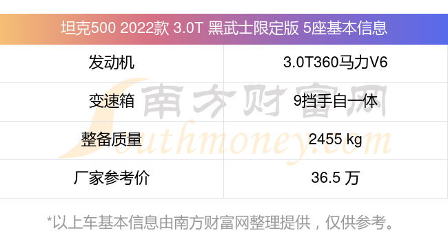 在動(dòng)力上,坦克500 2022款 3.0T 黑武士限定版 5座配備的是一臺(tái)3.0T360馬力V6雙渦輪增壓發(fā)動(dòng)機(jī),匹配的是9擋手自一體自動(dòng)檔變速箱,燃料形式為汽油+48V輕混系統(tǒng),常規(guī)整備質(zhì)量2455kg,廠家參考價(jià)36.5萬(wàn)元。