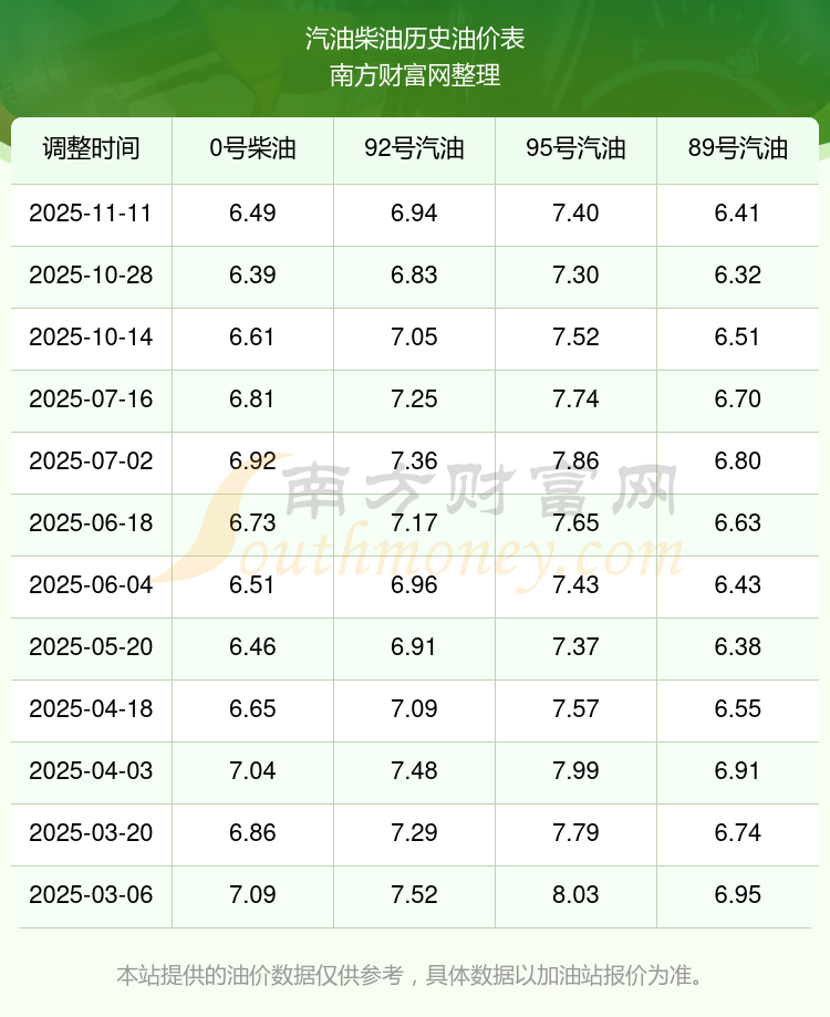 天水汽油、柴油11月16日的價格是多少錢一升?詳情為:92號汽油為6.94元,上升了0.11元;95號汽油為7.4元,上升了0.1元;89號汽油為6.41元,上升了0.09元;0號柴油為6.49元,上升了0.1元,本次油價的調(diào)整時間為11月11日。下一輪油價調(diào)整時間11月24日24時,距離現(xiàn)在還有8.36天。