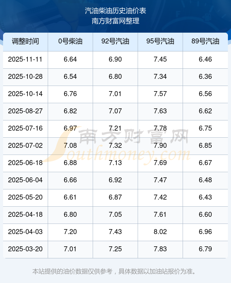 11月16日朔州95號(hào)汽油的價(jià)格是7.45元/升,油價(jià)于11月11日調(diào)整,相對(duì)上次調(diào)整時(shí)間10月28日的油價(jià)7.34元每升,共漲了0.11元,漲幅達(dá)1.499%。下一輪油價(jià)調(diào)整時(shí)間11月24日24時(shí),距離現(xiàn)在還有8.36天。