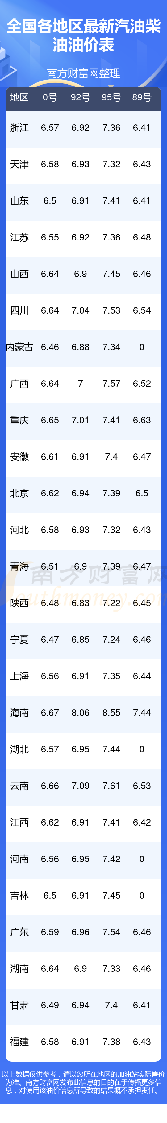 2025年11月16日全國各地汽油價(jià)格一覽表