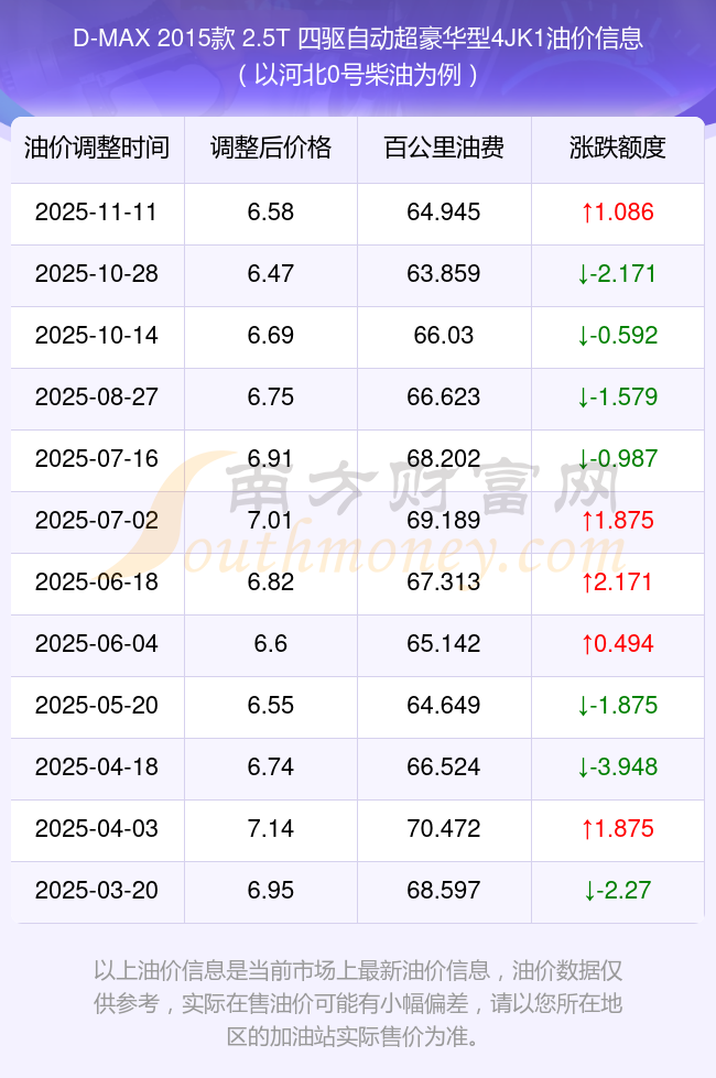 按照11月11日0號柴油最新調(diào)整價格6.58元/升來計算(以河北為例),該車型百公里平均油費為64.945元,按照上一輪10月28日調(diào)整價格6.47元/升來計算,百公里平均油費為63.859元,對比上一輪多花1.086元,下一輪油價調(diào)整時間為11月24日24時。