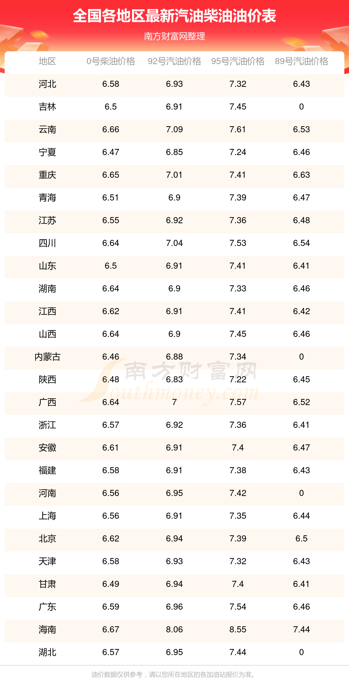 2025年全國(guó)各地區(qū)汽油價(jià)格表