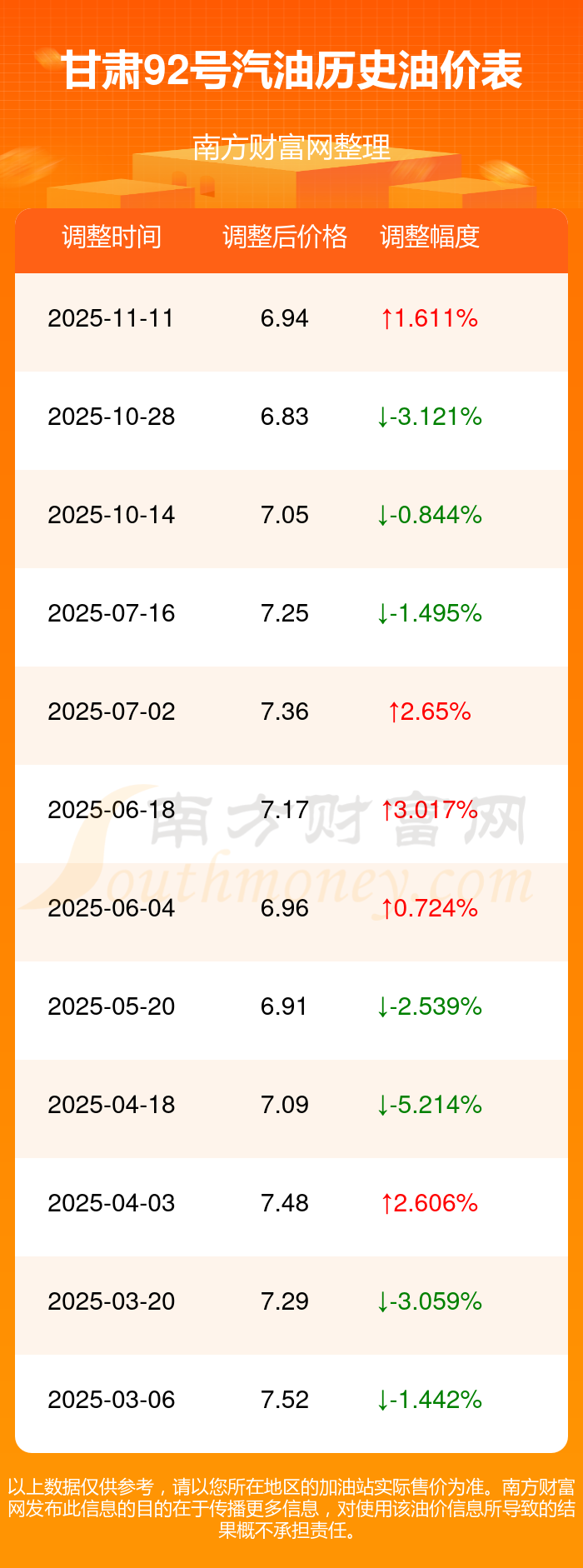 11月16日甘肅92號汽油的價格是11月11日調(diào)整后的價格,為6.94元/升,10月28日為上一輪油價調(diào)整時間,上次調(diào)整后甘肅92號汽油價格為6.83元/升,本次相比上升了0.11元,上升幅為1.611%。