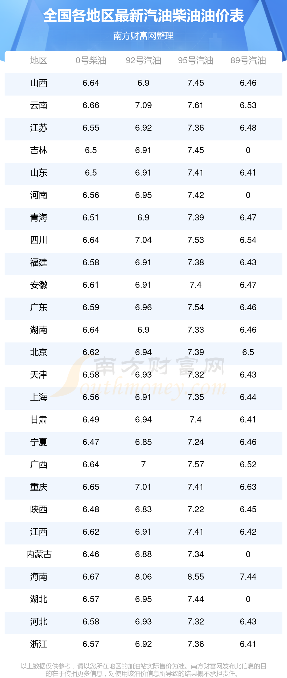 以上數(shù)據(jù)僅供參考,請(qǐng)以您所在地區(qū)的加油站實(shí)際售價(jià)為準(zhǔn)。南方財(cái)富網(wǎng)發(fā)布此信息的目的在于傳播更多信息,對(duì)使用該油價(jià)信息所導(dǎo)致的結(jié)果概不承擔(dān)責(zé)任。