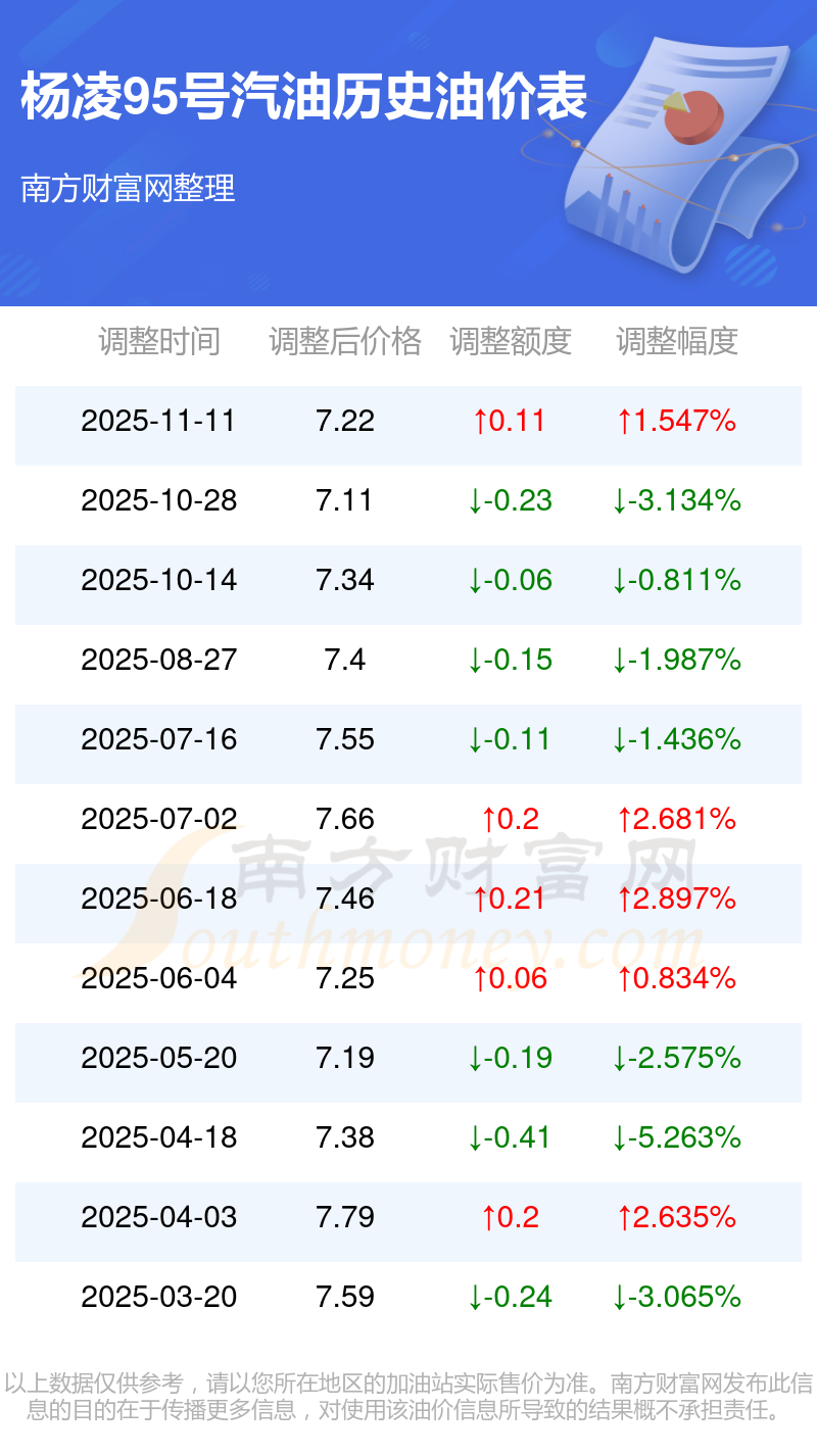 楊凌95號汽油11月16日的價格為11月11日調(diào)整后的價格,具體為7.22元/升,相對上次調(diào)整上調(diào)了0.11元。下一輪油價調(diào)整時間11月24日24時,距離現(xiàn)在還有8.3天。