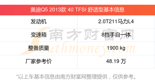 在動(dòng)力上,奧迪Q5 2013款 40 TFSI 舒適型配備的是一臺(tái)2.0T211馬力L4渦輪增壓發(fā)動(dòng)機(jī),匹配的是8擋手自一體自動(dòng)檔變速箱,燃料形式為汽油,常規(guī)整備質(zhì)量1900kg,廠家參考價(jià)48.19萬元。