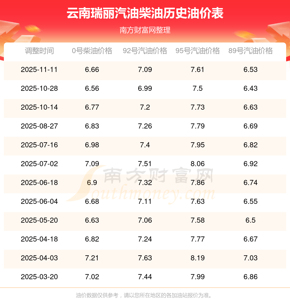 云南瑞麗汽油、柴油11月16日每升的價(jià)格為11月11日調(diào)整后的價(jià)格,具體油價(jià)為:92號(hào)汽油7.09元;95號(hào)汽油7.61元;89號(hào)汽油6.53元;0號(hào)柴油6.66元。