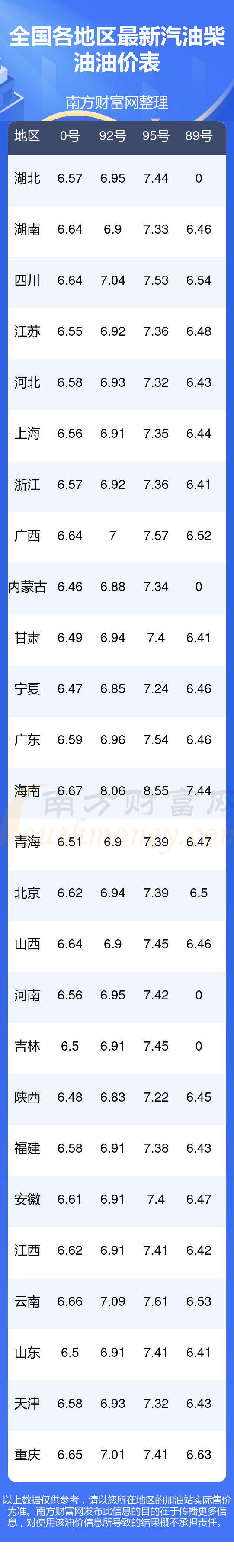 油價數(shù)據(jù)僅供參考,請以您所在地區(qū)的加油站報價為準。南方財富網(wǎng)發(fā)布此信息的目的在于傳播更多信息,對使用該油價信息所導(dǎo)致的結(jié)果概不承擔(dān)任何責(zé)任。