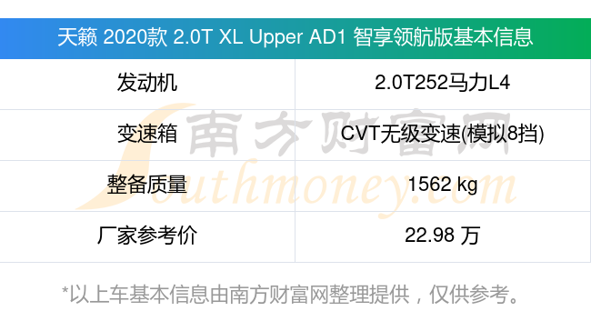 天籟 2020款 2.0T XL Upper AD1 智享領(lǐng)航版搭載了一臺(tái)2.0T252馬力L4渦輪增壓發(fā)動(dòng)機(jī),采用CVT無級(jí)變速(模擬8擋)自動(dòng)檔變速箱,常規(guī)整備質(zhì)量1562kg,廠家參考價(jià)22.98萬元。