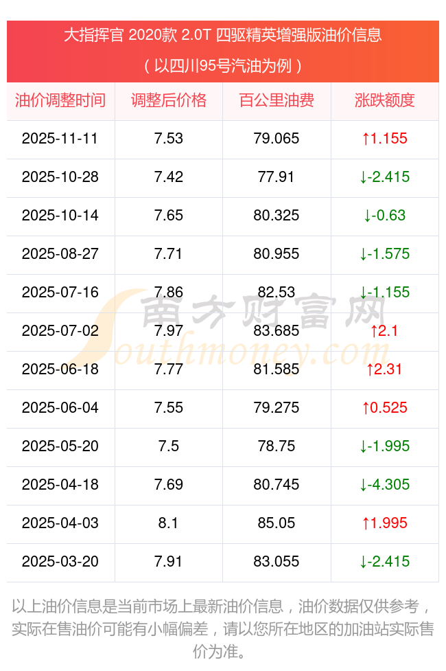 根據(jù)11月11日95號(hào)汽油最新調(diào)整價(jià)格7.53元/升來計(jì)算(以四川為例),該車型每百公里的平均油費(fèi)是79.065元,上一輪10月28日調(diào)整價(jià)格7.42元每升來計(jì)算,每百公里的平均油費(fèi)是77.91元,對比上一輪多花1.155元,下一輪的油價(jià)調(diào)整時(shí)間是11月24日24時(shí)。