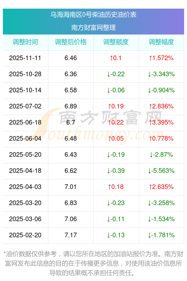 11月16日,烏海海南區(qū)0號柴油的價格為6.46元/升,這是11月11日油價調(diào)整后的價格,對比上一輪油價調(diào)整時間10月28日的價格6.36元每升,升了0.1元,升幅達1.572%。