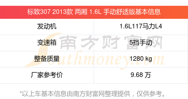 標(biāo)致307 2013款 兩廂 1.6L 手動舒適版動力上搭載的是一臺1.6L117馬力L4自然吸氣發(fā)動機(jī),匹配5擋手動擋變速箱,燃料形式為汽油,常規(guī)整備質(zhì)量1280kg,廠家參考價(jià)9.68萬元。