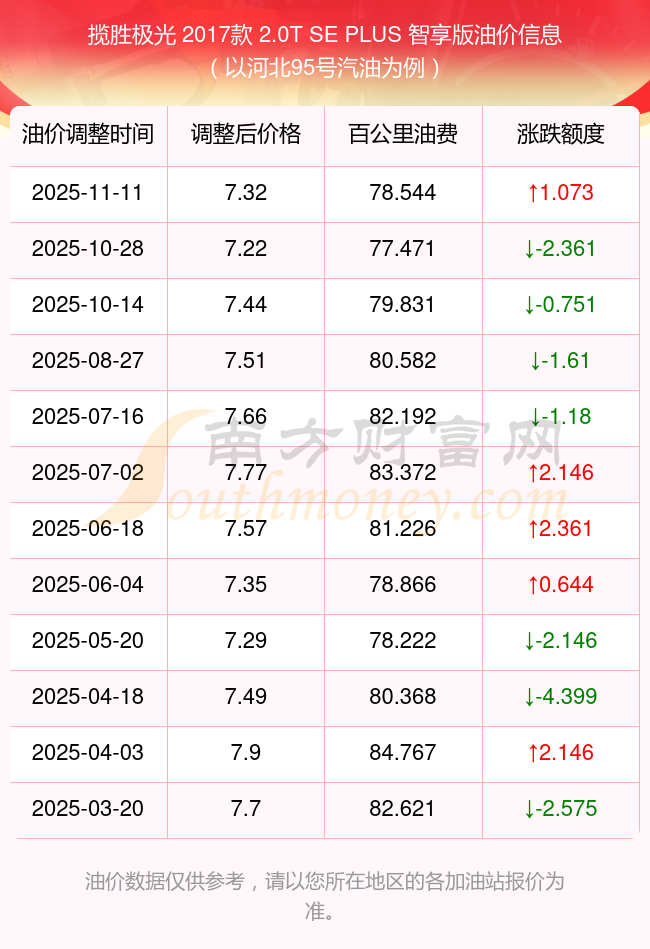 按照11月11日95號汽油最新調(diào)整價格7.32元/升來計算(以河北為例),該車型百公里平均油費為78.544元,按照上一輪10月28日調(diào)整價格7.22元/升來計算,百公里平均油費為77.471元,對比上一輪多花1.073元,下一輪油價調(diào)整時間為11月24日24時。