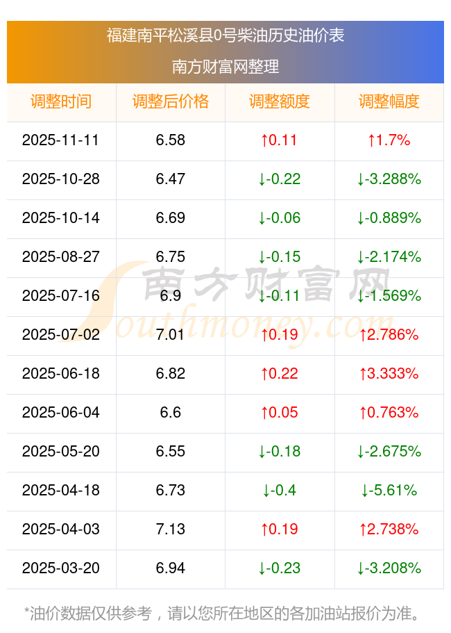 11月16日福建南平松溪縣0號(hào)柴油歷史油價(jià)調(diào)整一覽表