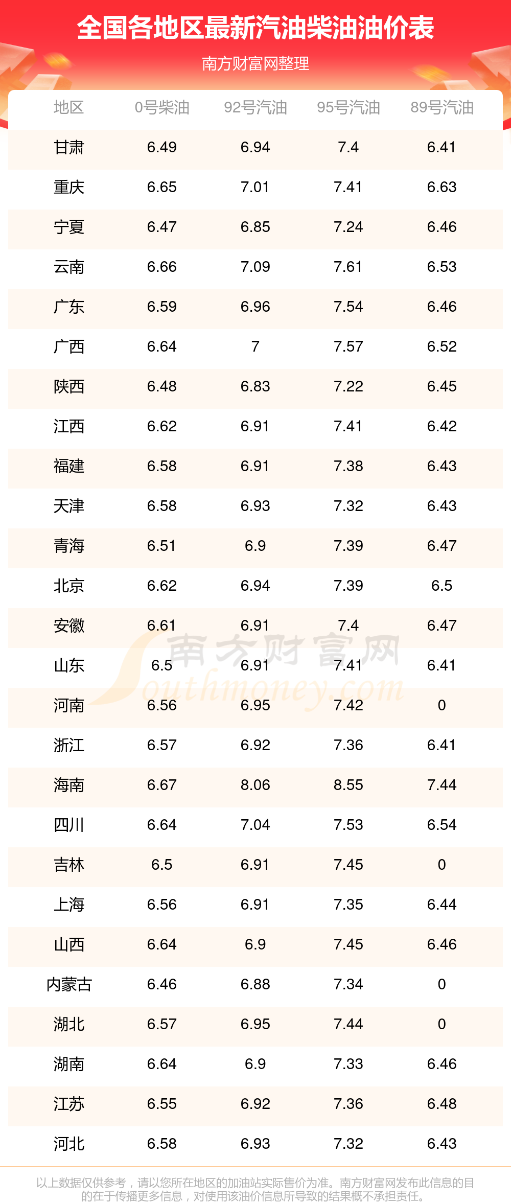 全國(guó)0號(hào)柴油最新平均價(jià)格為:7元每升,其中,最低為內(nèi)蒙古,價(jià)格為6.46元/升,最高為海南,價(jià)格為6.67元/升。
