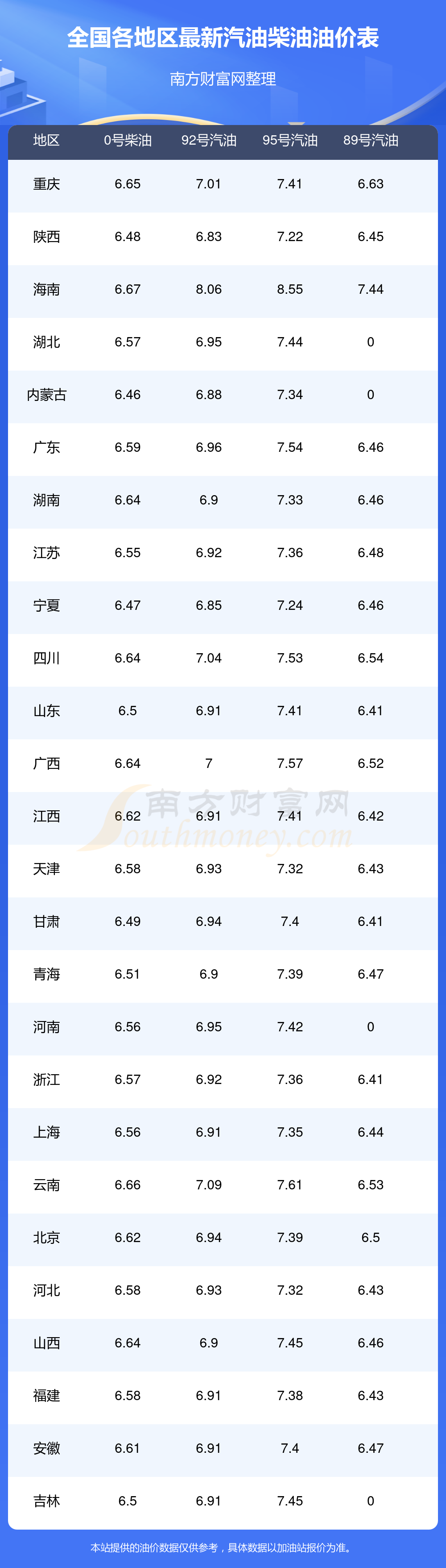 油價(jià)調(diào)整最新消息:下一輪油價(jià)調(diào)整時(shí)間11月24日24時(shí)。11月16日廈門思明區(qū)汽油柴最新油價(jià)是多少?具體每升為:11月11日調(diào)整后,92號(hào)汽油為6.91元,增了0.1元,增幅達(dá)1.47%;95號(hào)汽油為7.38元,增了0.11元,增幅達(dá)1.51%;89號(hào)汽油為6.43元,增了0.09元,增幅達(dá)1.42%;0號(hào)柴油為6.58元,增了0.11元,增幅達(dá)1.7%。