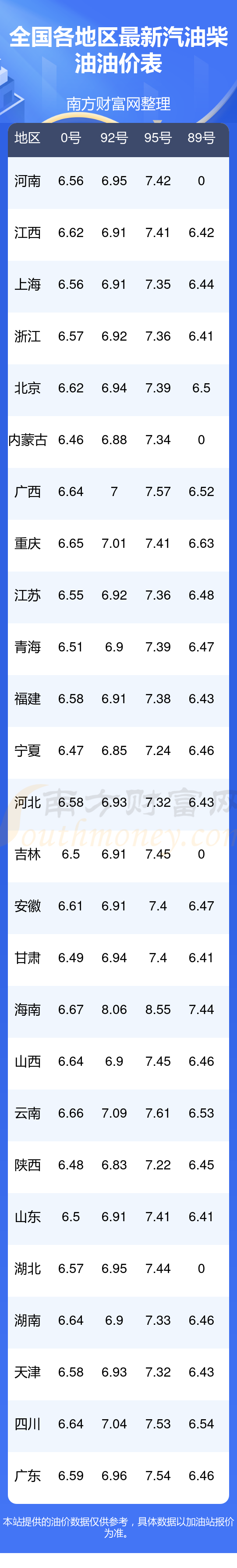 全國(guó)89號(hào)汽油最新平均價(jià)格為:7元每升,其中,最低為浙江,價(jià)格為6.41元/升,最高為海南,價(jià)格為7.44元/升。