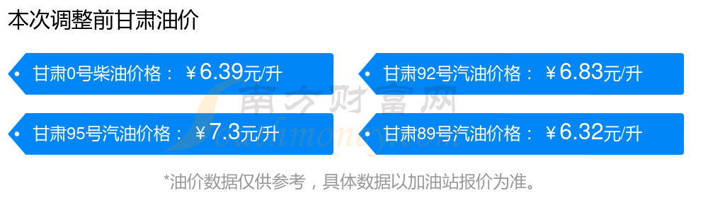 11月16日甘肅汽油、柴油的價(jià)格為11月11日調(diào)整后的價(jià)格。每升最新價(jià)格為:92號汽油6.94元,升了0.11元;95號汽油7.4元,升了0.1元;89號汽油6.41元,升了0.09;0號柴油6.49元,升了0.1元。