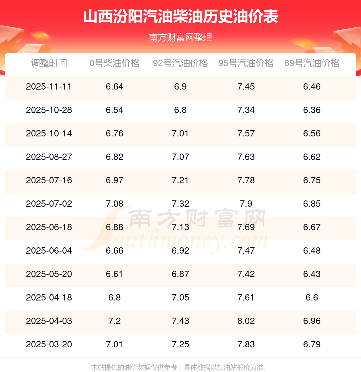 11月16日山西汾陽汽油、柴油價格是多少錢一升?11月11日調整后,92號汽油為6.9元,升了0.1元,升幅達1.47%;95號汽油為7.45元,升了0.11元,升幅達1.5%;89號汽油為6.46元,升了0.1元,升幅達1.57%;0號柴油為6.64元,升了0.1元,升幅達1.53%。