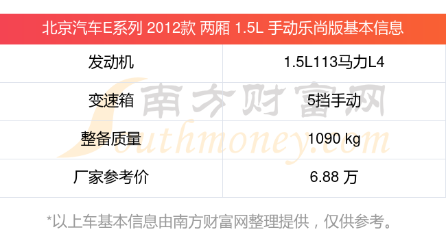 北京汽車E系列 2012款 兩廂 1.5L 手動樂尚版動力方面,搭載的是一臺1.5L113馬力L4自然吸氣發(fā)動機(jī),匹配5擋手動擋變速箱,燃料形式為汽油,常規(guī)整備質(zhì)量1090kg,廠家參考價(jià)6.88萬元。