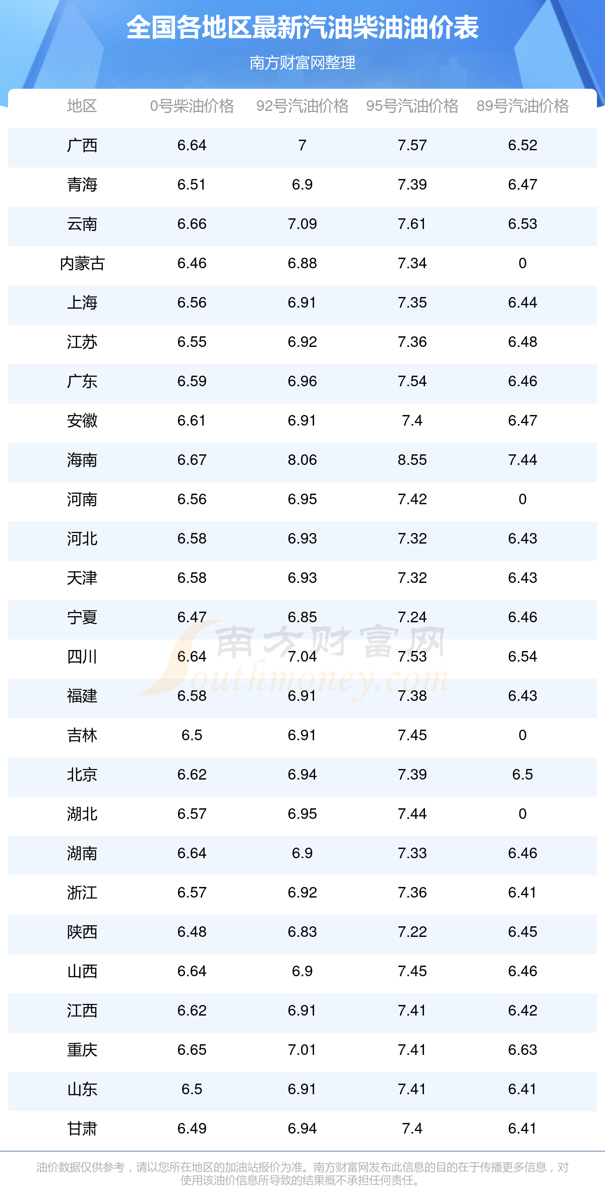 以上油價信息是當(dāng)前市場上最新油價信息,油價數(shù)據(jù)僅供參考,實際在售油價可能有小幅偏差,請以您所在地區(qū)的加油站實際售價為準(zhǔn)。