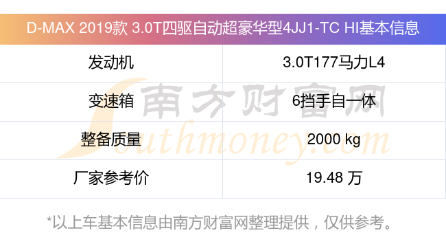 D-MAX 2019款 3.0T四驅(qū)自動(dòng)超豪華型4JJ1-TC HI搭載了一臺(tái)3.0T177馬力L4渦輪增壓發(fā)動(dòng)機(jī),采用6擋手自一體自動(dòng)檔變速箱,常規(guī)整備質(zhì)量2000kg,廠家參考價(jià)19.48萬元。