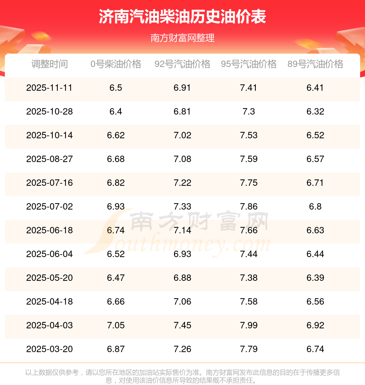 11月16日濟(jì)南汽油、柴油每升的價格是11月11日調(diào)整后的價格:92號汽油為6.91元,增了0.1元,增幅達(dá)1.47%;95號汽油為7.41元,增了0.11元,增幅達(dá)1.51%;89號汽油為6.41元,增了0.09元,增幅達(dá)1.42%;0號柴油為6.5元,增了0.1元,增幅達(dá)1.56%。