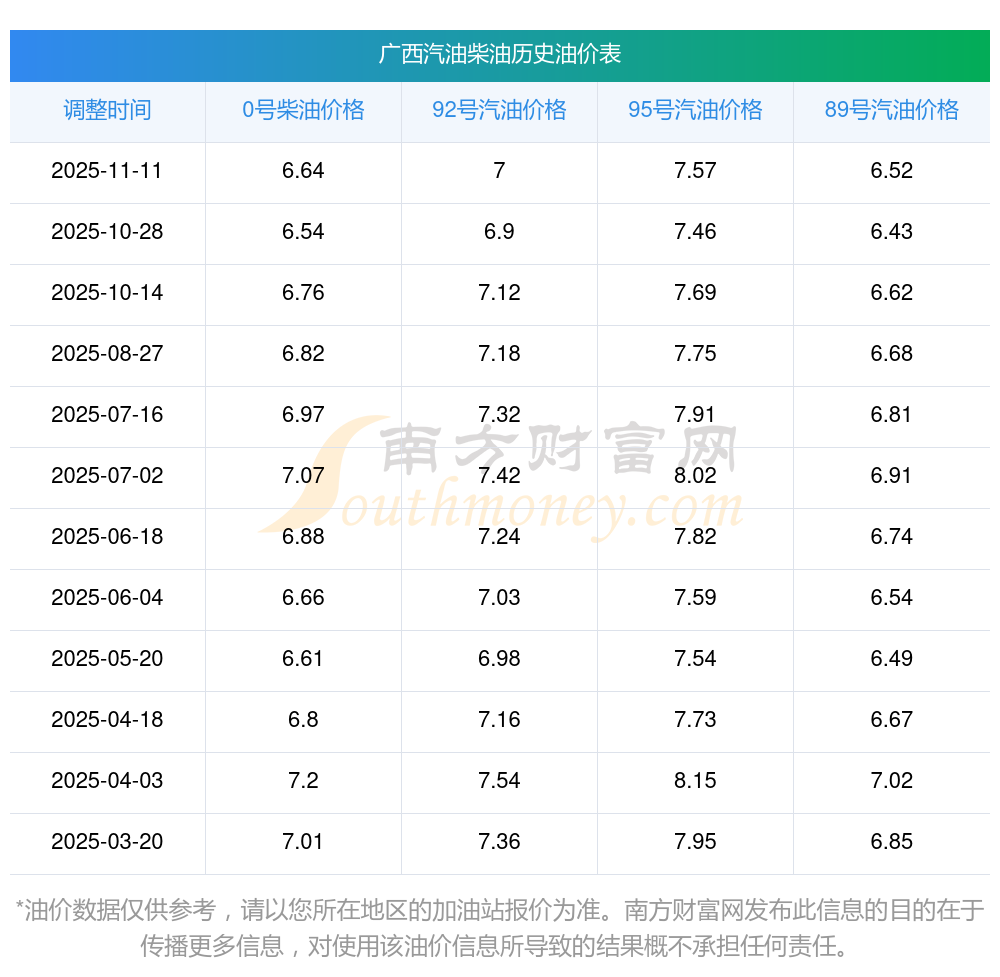 11月16日,廣西92號(hào)汽油的價(jià)格是7元每升,本次的調(diào)整時(shí)間為11月11日,對(duì)比上次的調(diào)整上升了0.1元,上升1.449%,下次調(diào)整時(shí)間為11月24日24時(shí),還有8.11天。