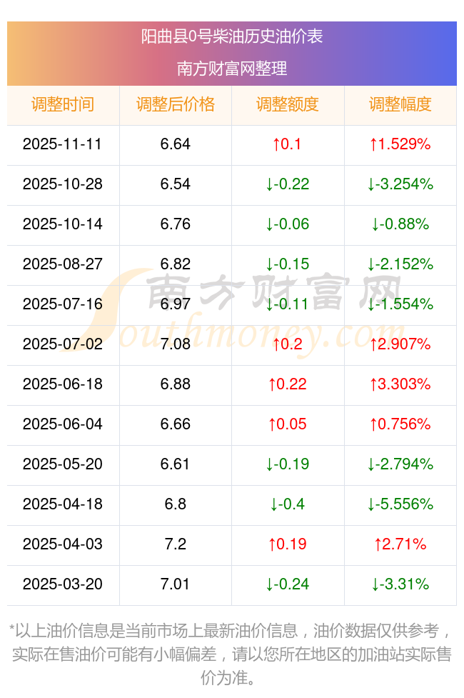 11月16日陽(yáng)曲縣0號(hào)柴油歷史油價(jià)一覽表