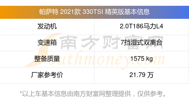 在動(dòng)力上,帕薩特 2021款 330TSI 精英版配備的是一臺(tái)2.0T186馬力L4渦輪增壓發(fā)動(dòng)機(jī),匹配的是7擋濕式雙離合自動(dòng)檔變速箱,燃料形式為汽油,常規(guī)整備質(zhì)量1575kg,廠(chǎng)家參考價(jià)21.79萬(wàn)元。