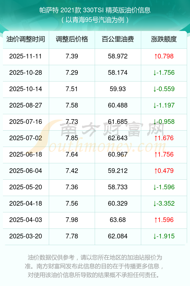 按11月11日95號(hào)汽油最新調(diào)整價(jià)格7.39元每升來(lái)計(jì)算(以青海為例),該車(chē)型百公里平均油費(fèi)為58.972元,按上一輪10月28日調(diào)整價(jià)格7.29元每升來(lái)計(jì)算,百公里平均油費(fèi)為58.174元,對(duì)比上一輪多花0.798元,下一輪油價(jià)調(diào)整時(shí)間為11月24日24時(shí)。