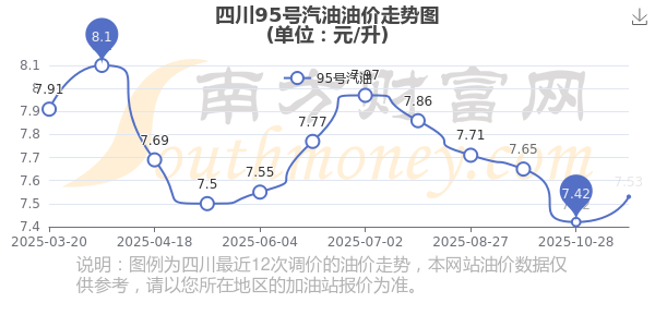 11月16日,四川95號(hào)汽油的價(jià)格是7.53元每升,本次的調(diào)整時(shí)間為11月11日,對比上次的調(diào)整升了0.11元,升1.482%,下次調(diào)整時(shí)間為11月24日24時(shí),還有8.1天。
