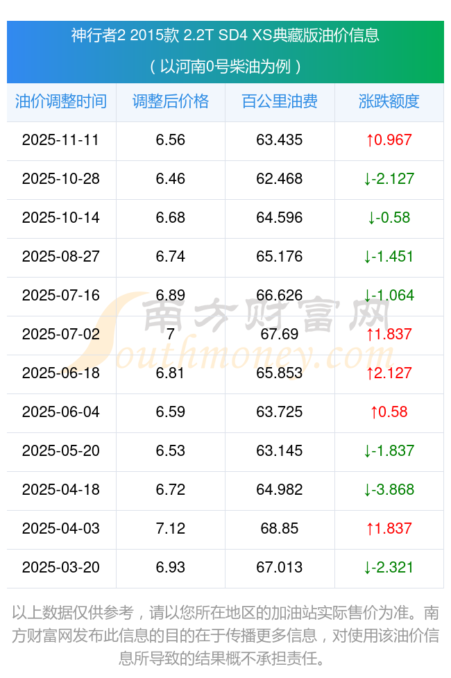 按照11月11日0號(hào)柴油最新調(diào)整價(jià)格6.56元/升來(lái)計(jì)算(以河南為例),該車型百公里平均油費(fèi)為63.435元,按照上一輪10月28日調(diào)整價(jià)格6.46元/升來(lái)計(jì)算,百公里平均油費(fèi)為62.468元,對(duì)比上一輪多花0.967元,下一輪油價(jià)調(diào)整時(shí)間為11月24日24時(shí)。