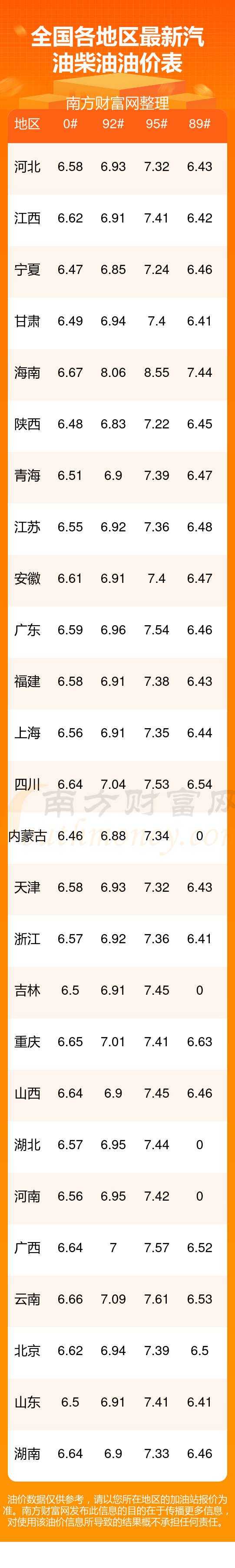 全國各地區(qū)最新油價表