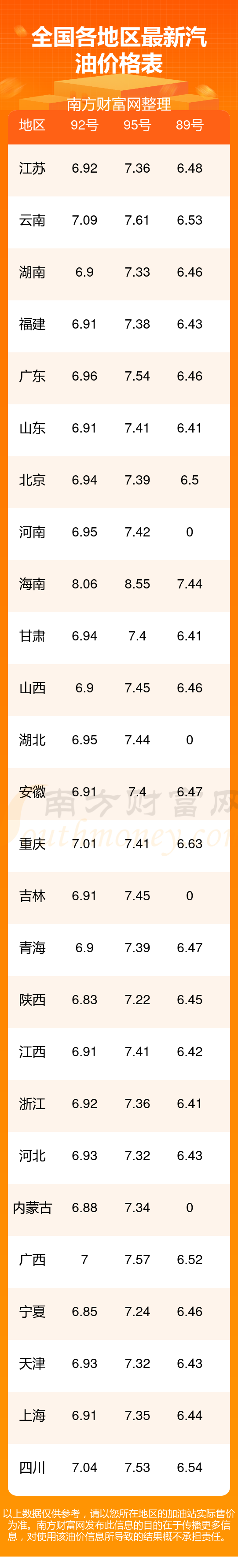 2025年全國各地區(qū)最新油價表