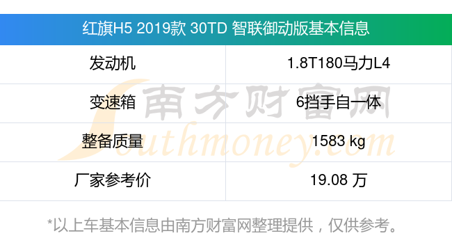 在動力上,紅旗H5 2019款 30TD 智聯(lián)御動版配備的是一臺1.8T180馬力L4渦輪增壓發(fā)動機,匹配的是6擋手自一體自動檔變速箱,燃料形式為汽油,常規(guī)整備質(zhì)量1583kg,廠家參考價19.08萬元。