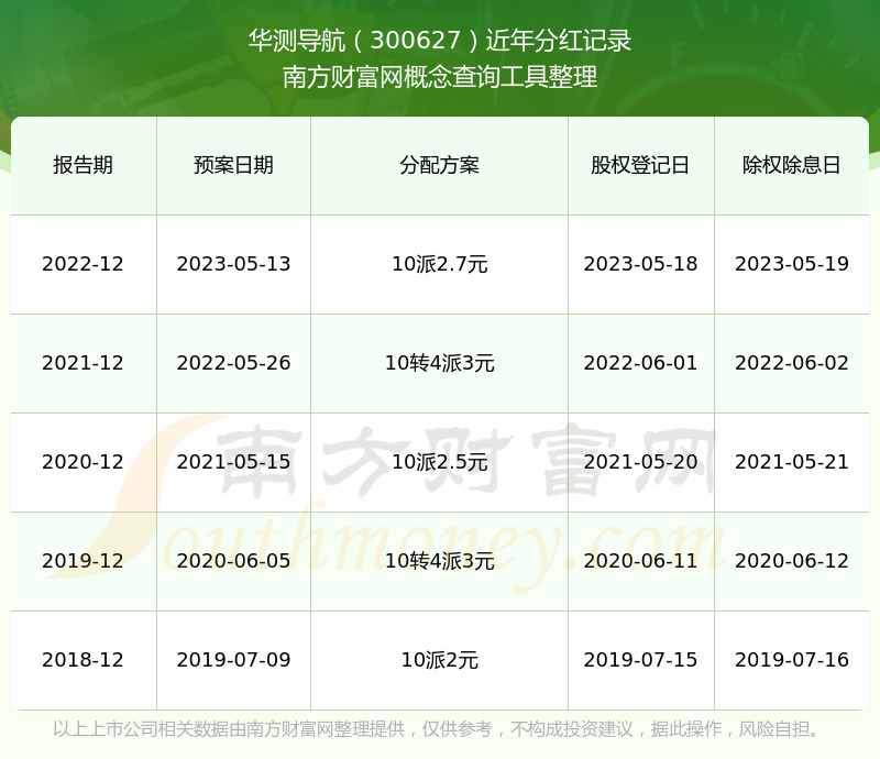 華測導航最新一次公布的分紅方案為10派2.7元。本次權益分派股權登記日為2023年5月18日,除權除息日為2023年5月19日,派息日為2023年5月19日。