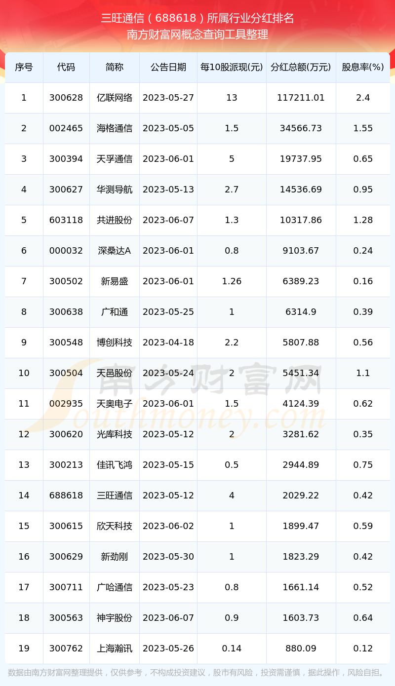 二、三旺通信688618行業(yè)分紅排名