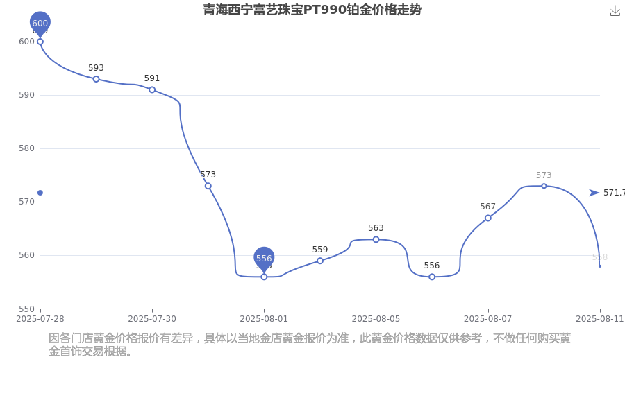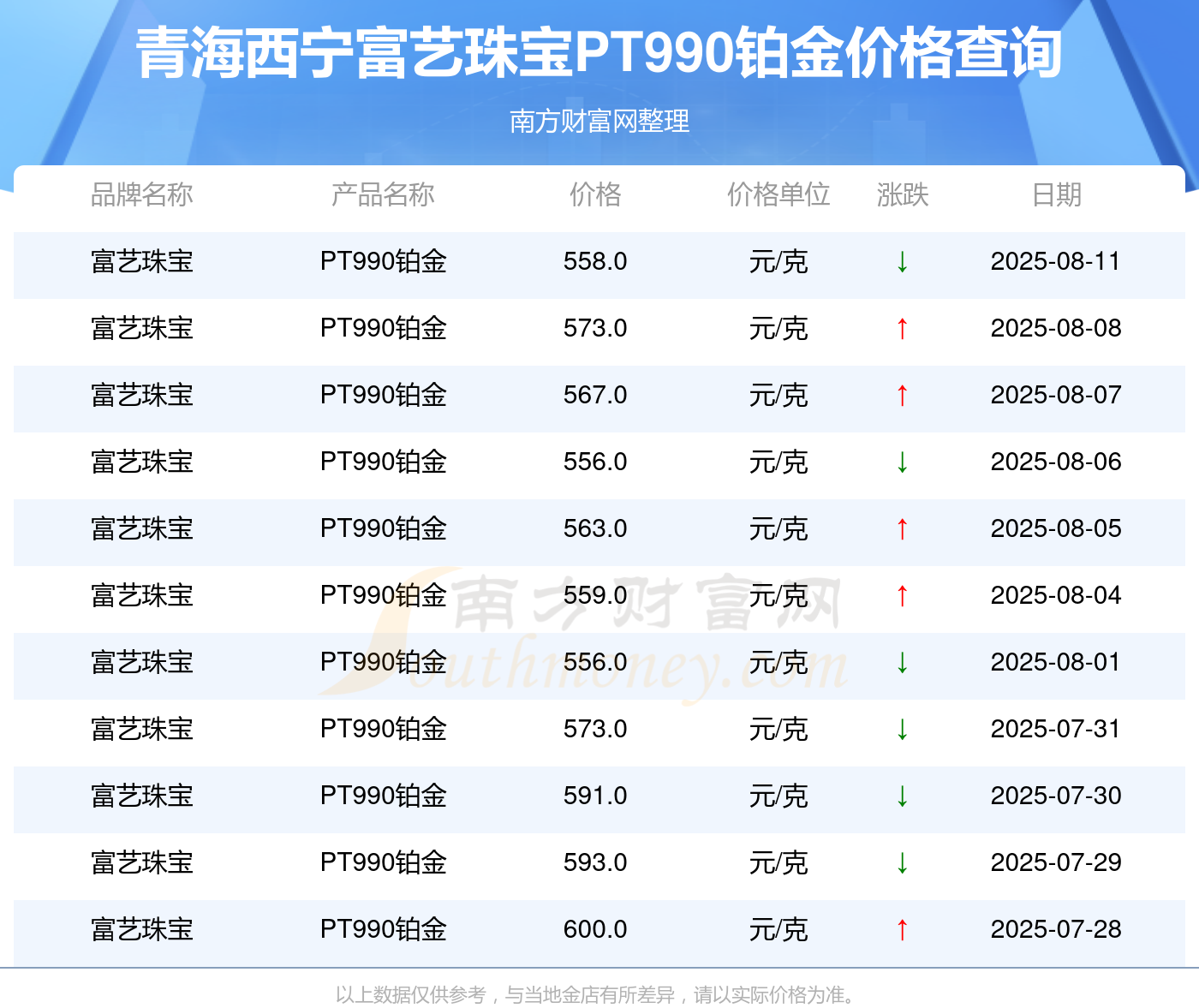 今日(2025年8月11日)青海西寧富藝珠寶PT990鉑金價(jià)格:558.0元/克。