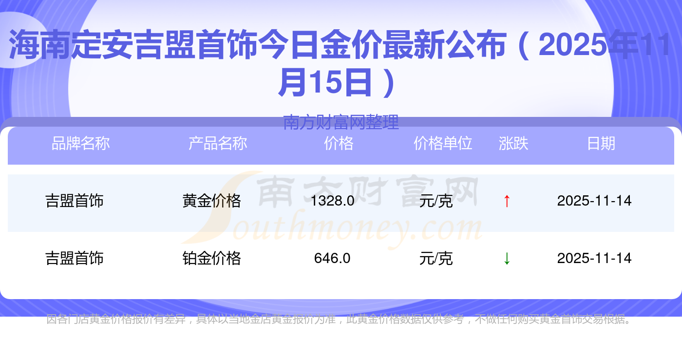 2025年11月15日海南定安吉盟首飾現(xiàn)在黃金一克要多少錢:黃金價格1333.0元/克,鉑金價格646.0元/克,飾品金價(內地)1333.0元/克,黃金飾品(香港)46320.0,鉑金價格(香港)18410.0,金條價格(香港)41780.0,金條金價(內地)1167.0元/克,黃金價格1322.0元/克,鉑金價格600.0元/克,足金價格1322.0元/克,黃金價格1295.0元/克。