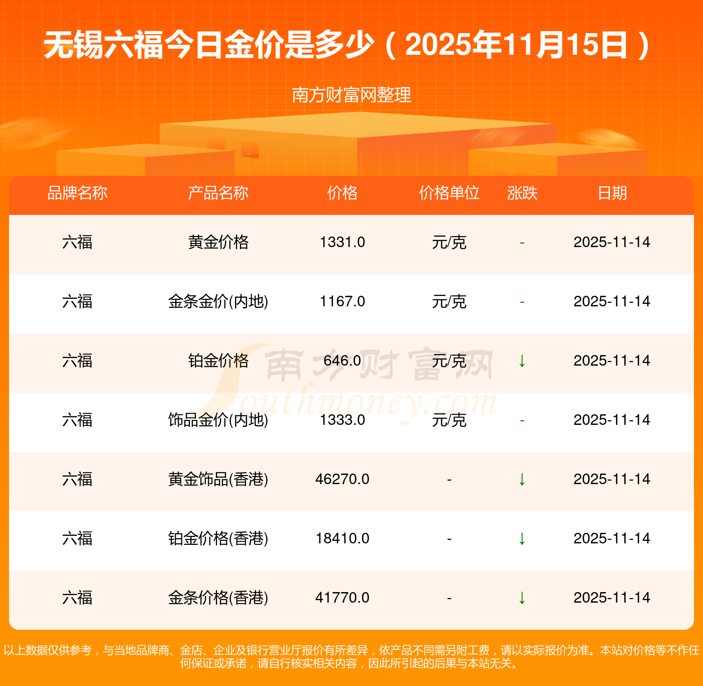以上數(shù)據(jù)僅供參考,與當(dāng)?shù)仄放粕獭⒔鸬、企業(yè)及銀行營(yíng)業(yè)廳報(bào)價(jià)有所差異,依產(chǎn)品不同需另附工費(fèi),請(qǐng)以實(shí)際報(bào)價(jià)為準(zhǔn)。本站對(duì)價(jià)格等不作任何保證或承諾,請(qǐng)自行核實(shí)相關(guān)內(nèi)容,因此所引起的后果與本站無(wú)關(guān)。
