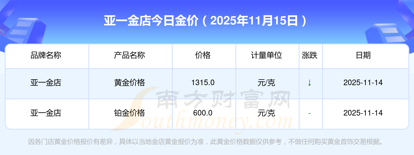 2025年11月15日亞一金店今日價格:黃金價格1333.0元/克,鉑金價格646.0元/克,飾品金價(內(nèi)地)1333.0元/克,黃金飾品(香港)46320.0,鉑金價格(香港)18410.0,金條價格(香港)41780.0,金條金價(內(nèi)地)1167.0元/克,黃金價格1322.0元/克,鉑金價格600.0元/克,足金價格1322.0元/克,黃金價格1295.0元/克。