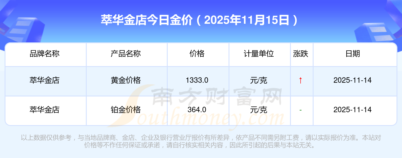 2025年11月15日萃華金店金價(jià)查詢:黃金價(jià)格1333.0元/克,鉑金價(jià)格646.0元/克,飾品金價(jià)(內(nèi)地)1333.0元/克,黃金飾品(香港)46320.0,鉑金價(jià)格(香港)18410.0,金條價(jià)格(香港)41780.0,金條金價(jià)(內(nèi)地)1167.0元/克,黃金價(jià)格1322.0元/克,鉑金價(jià)格600.0元/克,足金價(jià)格1322.0元/克,黃金價(jià)格1295.0元/克。