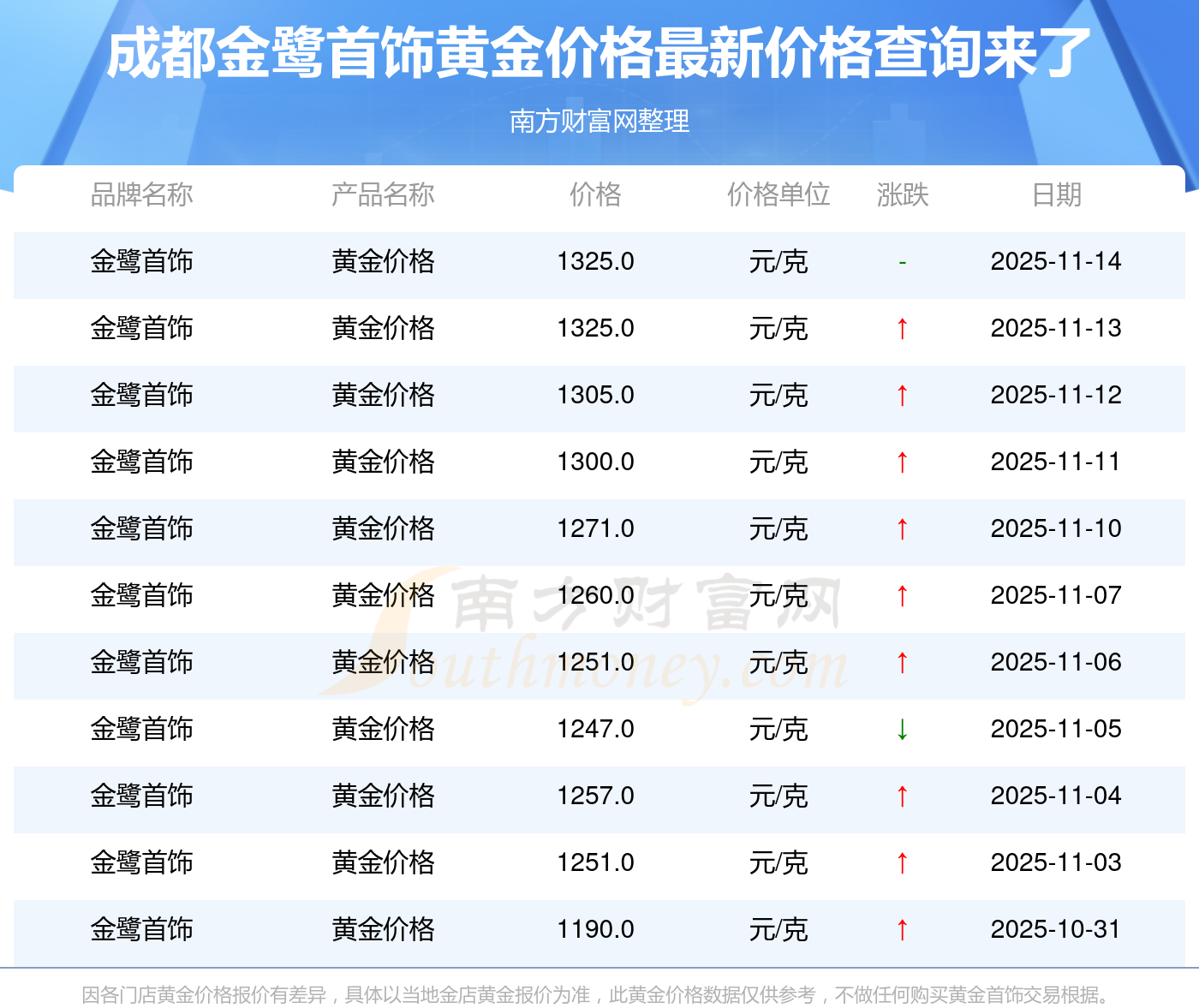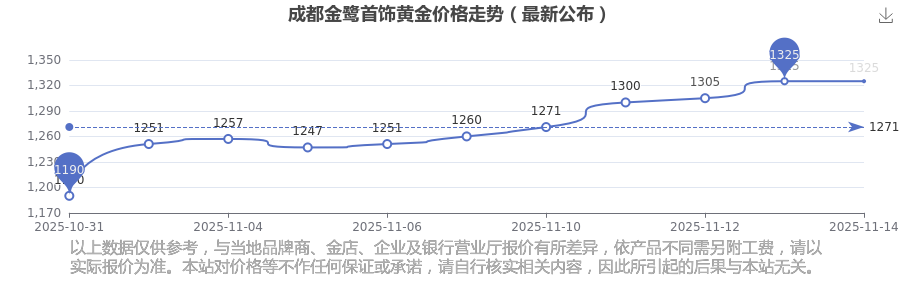 2025年11月15日,成都金鷺首飾黃金價(jià)格每克的價(jià)值量定格在1325.0元/克。